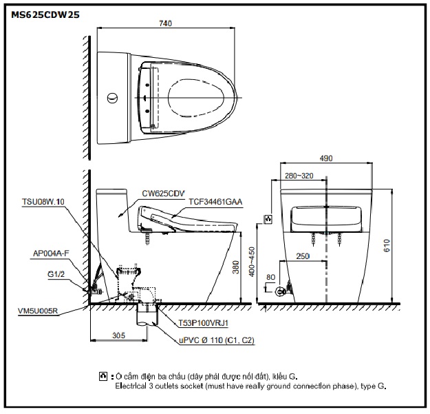 Bản vẽ kỹ thuật bồn cầu 1 khối nắp điện tử TOTO MS625DW25 (MS625CDW25)