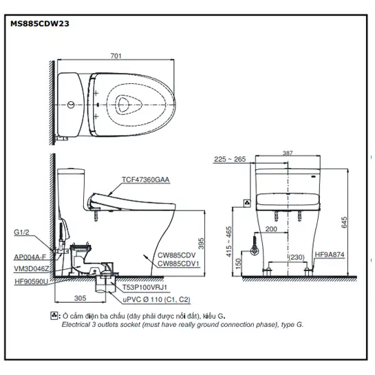 Bản vẽ kỹ thuật bồn cầu 1 khối nắp rửa điện tử WASHLET (loại giấu dây) dòng C2 TOTO MS885CDW23