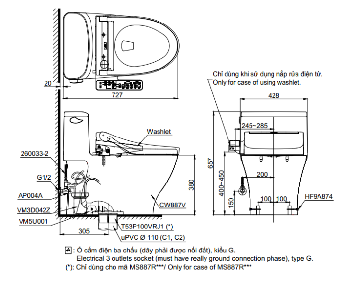Bản vẽ kỹ thuật bồn cầu 1 khối nắp rửa điện tử WASHLET dòng C2 TOTO MS887RW16