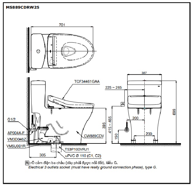 Bản vẽ kỹ thuật bồn cầu 1 khối dấu giây nắp rửa điện tử C5 TOTO MS889DRW25 (MS889CDRW25)