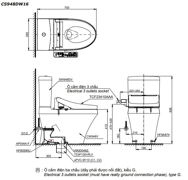 Bản vẽ kỹ thuật bồn cầu 2 khối nắp rửa điện tử WASHLET dòng C2 TOTO CS948DW16