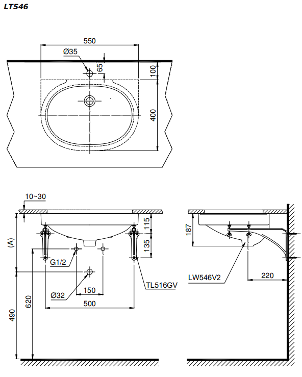Bản vẽ kỹ thuật chậu rửa Lavabo TOTO âm bàn LT546