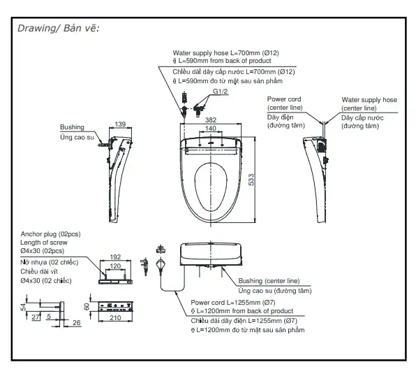 - Thiết kế: dành cho bồn cầu thân dài, giấu dây, bồn cầu thường và sử dụng điều khiển từ xa