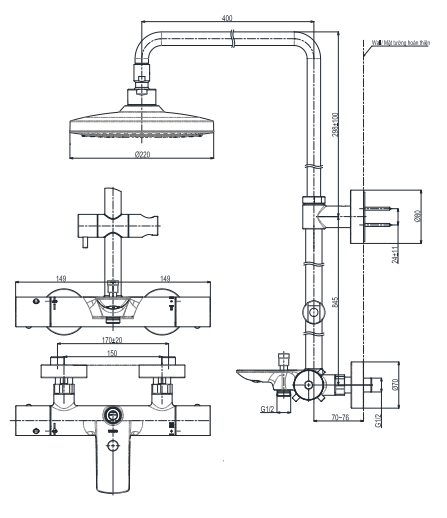 - Kích thước: 220mm (bát sen cố định một chế độ)